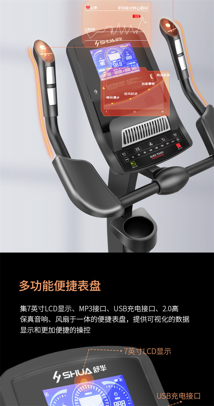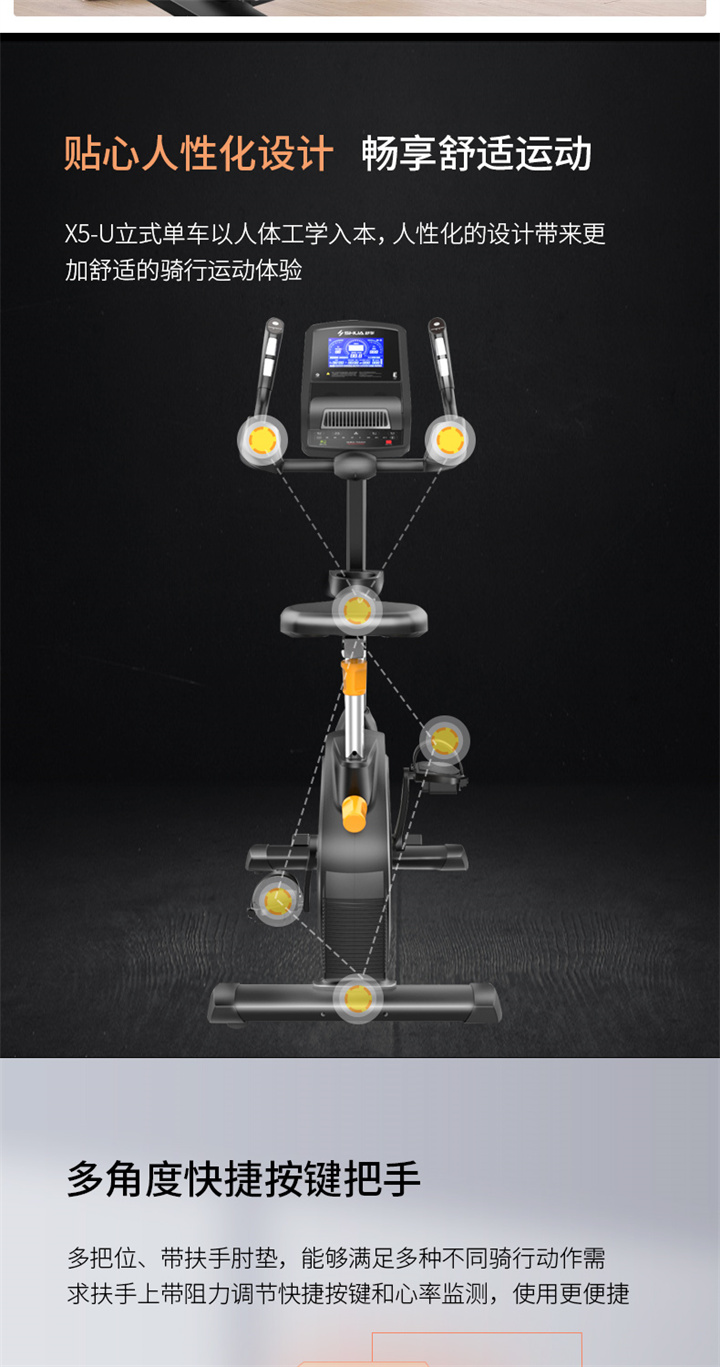 舒華立式商用健身車SH-B9100U(V10)觸屏版擁有超大顯示和操作屏幕, 可以任意設(shè)置阻力、時間和距離等參數(shù),還可以即時顯示心跳和轉(zhuǎn)速等數(shù)據(jù),同時,SH-B9100U提供多項科學(xué)運動處方,更輕松掌握運動節(jié)奏。