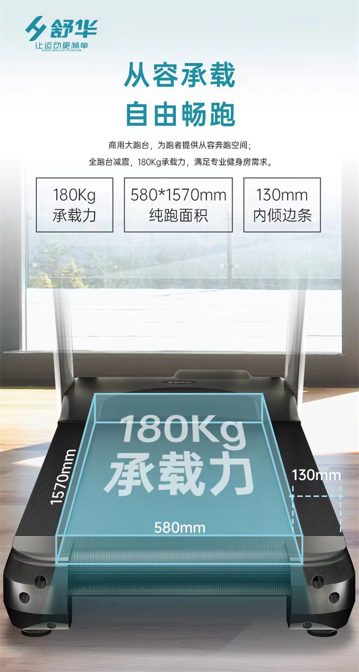 舒華商用跑步機(jī)SH-T8919采用t2.2mm黑鉆紋(可選配:t2.4免維護(hù)跑帶)的跑帶,,選用手握心率測(cè)試 自帶心率帶及增加心率控速(HRC)程序模塊、接觸式心率感應(yīng)測(cè)量心跳等數(shù)據(jù),跑步面積達(dá)580×1570mm,可承受180kg的使用者使用。